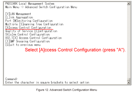 In Advanced Switch Configuration Menu, select Access Control Configuration. (Refer to Figure 12)