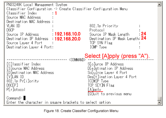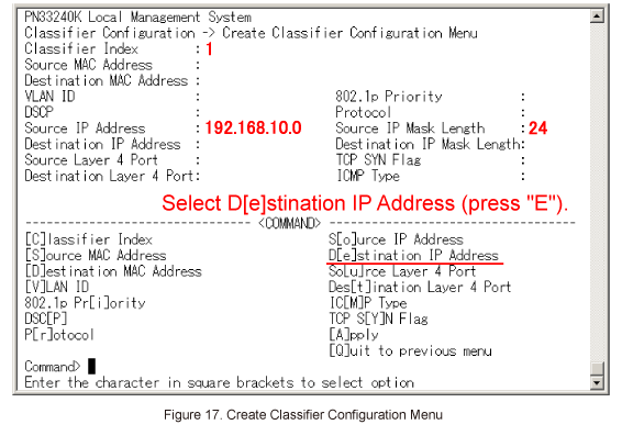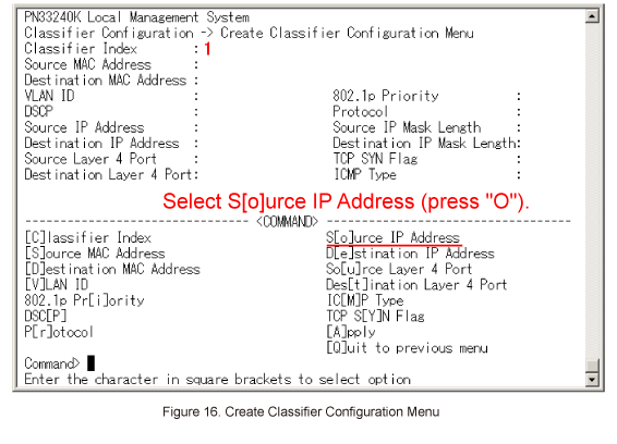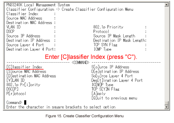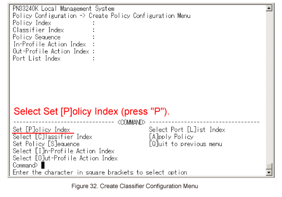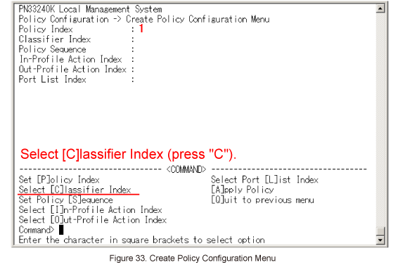 In Create Policy Configuration Menu, select Select [C]lassifier Index. (Refer to Figure 33)