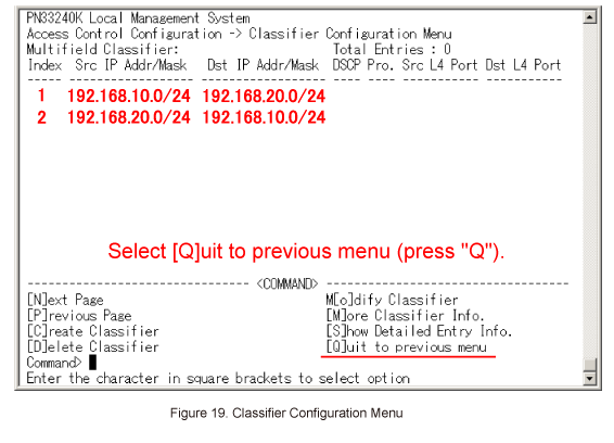 Select [Q]uit to previous menu (press "Q") to go back to Access Control Configuration Menu. (Refer to Figure 19)