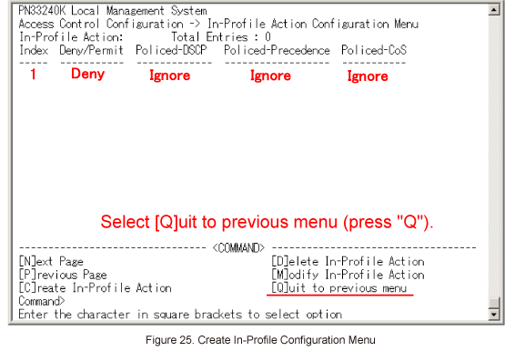When In-Profile Action Configuration Menu is displayed again, select [Q]uit to previous menu to go back to Access Control Configuration Menu. (Refer to Figure 25)