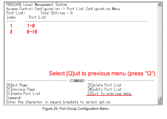 Once all of the items are entered in Port List Configuration Menu, select [Q]uit to previous menu. (Refer to Figure 29)