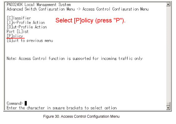 In Access Control Configuration Menu, select [P]olicy. (Refer to Figure 30)