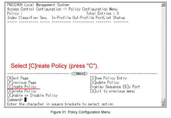 In Policy Configuration Menu, select [C]reate Policy. (Refer to Figure 31)