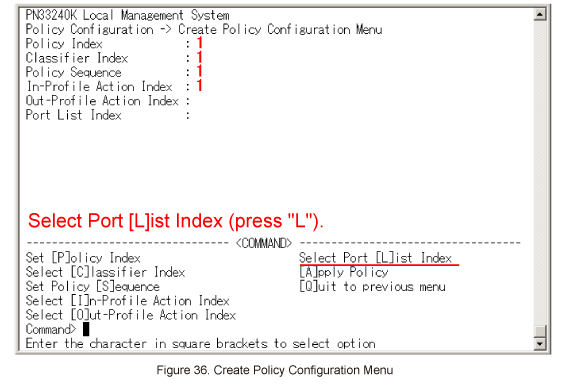 In Create Policy Configuration Menu, select Select Port [L]ist Index. (Refer to Figure 36)