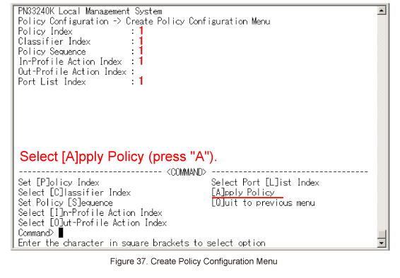 Once all of the items are entered in Create Policy Configuration Menu, select [A]pply Policy. (Refer to Figure 37)
