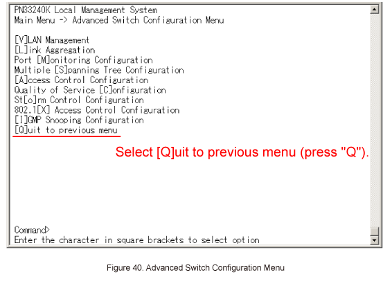 In Advanced Switch Configuration Menu, select [Q]uit to previous menu. (Refer to Figure 40)