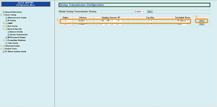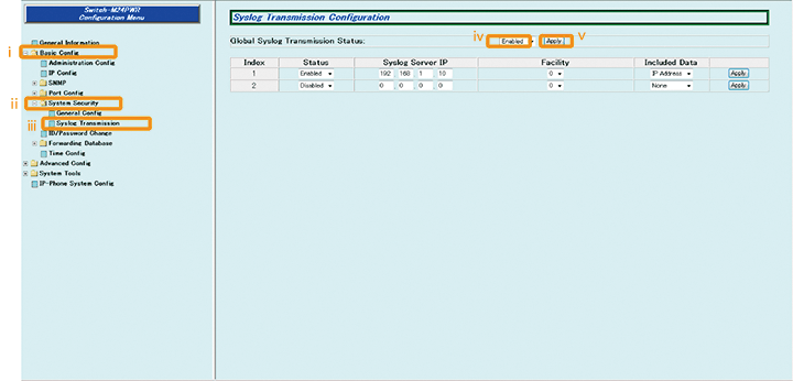 1) Select “Basic Config” → “System Security” → “Syslog Transmission” (i → ii → iii).