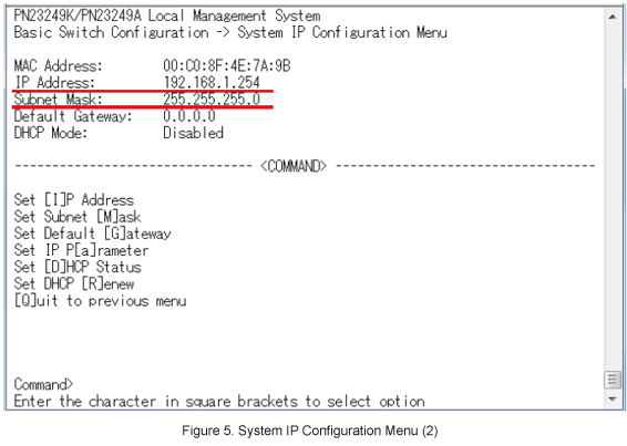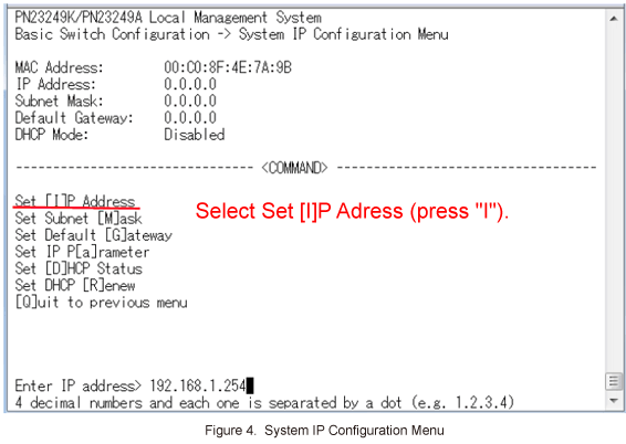 In System IP Configuration Menu, select Set [I]P Address and enter the IP address (192.168.1.254). (Refer to Figure 4)
