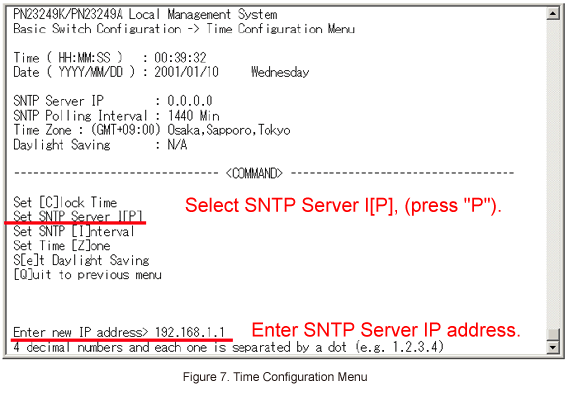 In Time Configuration Menu, select Set SNTP Server I[P] and enter the IP address of the SNTP server. (Refer to Figure 7)