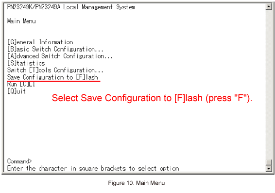 When all of the settings are complete, go back to the Main Menu using [Q]uit to previous menu, and from Main Menu select Save Configuration to [F]lash to save the settings. (Refer to Figure 10)