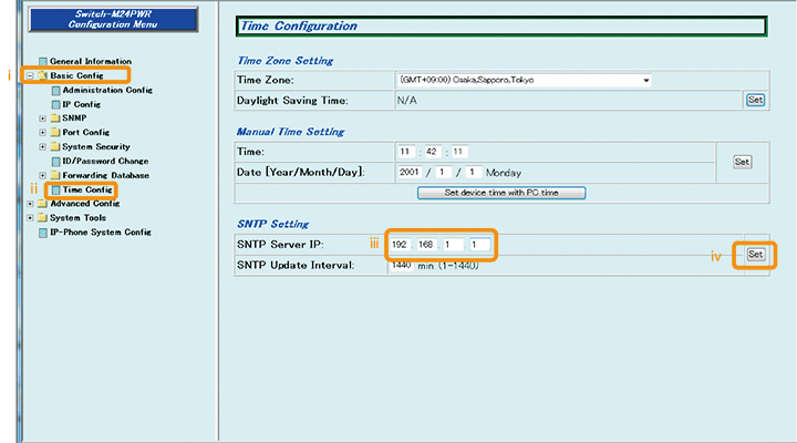 This setting example explains the SNTP time synchronization for switches for WEB. (In this setting example, manual time setting is not performed)