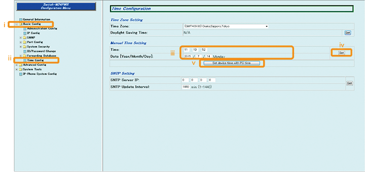 This setting example explains the procedure of manually setting the time of switches for WEB. (In this setting example, SNTP time setting is not performed)