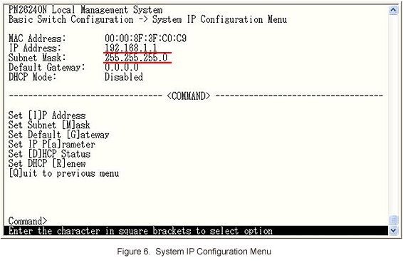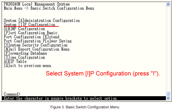 In Basic Switch Configuration Menu, select System [I]P Configuration and set the IP address. (Refer to Figure 3)