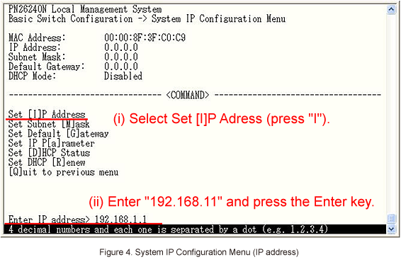 In System IP Configuration Menu, select Set [I]P Address and enter the IP address (192.168.1.1). (Refer to Figure 4)