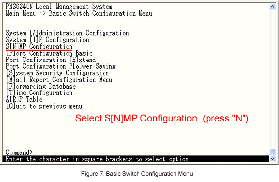 In Basic Switch Configuration Menu, select S[N]MP Configuration. (Refer to Figure 7)