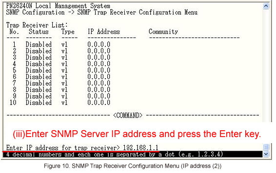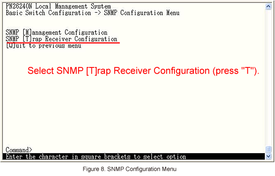 In SNMP Configuration Menu, select SNMP [T]rap Receiver Configuration to perform the trap notification setting. (Refer to Figure 8)