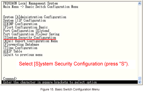 In Basic Switch Configuration Menu, select [S]ystem Security Configuration to perform the setting for enabling SNMP. (Refer to Figure 15)