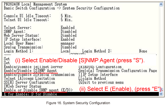 In System Security Configuration, select Enable/Disable [S]NMP Agent to enable SNMP. (Refer to Figure 16)