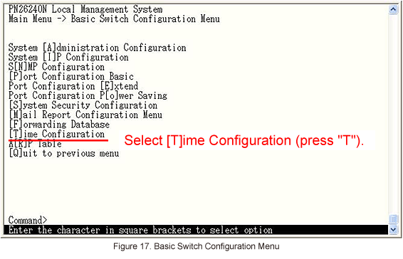In Basic Switch Configuration Menu, select [T]ime Configuration to set time synchronization with the SNTP server. (Refer to Figure 17)