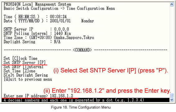 In Time Configuration Menu, select Set SNTP Server I[P] to set the IP address (192.168.1.2) of the SNTP server. (Refer to Figure 18)
