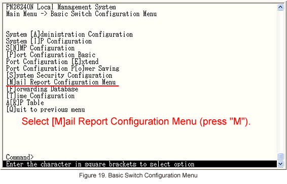In Basic Switch Configuration Menu, select [M]ail Report Configuration Menu to perform the E-mail notification setting. (Refer to Figure 19)