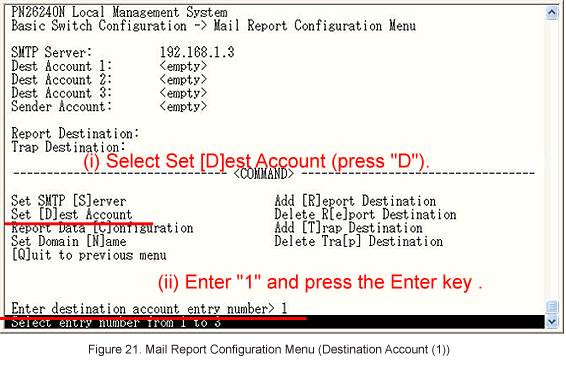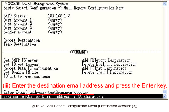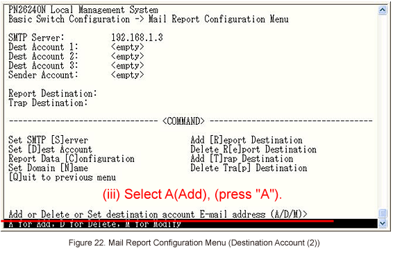 Then, select Set [D]est Account and set e-mail addresses to receive notifications. (Refer to Figures 21, 22, and 23)