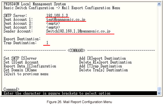 In Mail Report Configuration Menu, select Set SMTP [S]erver to set the IP address of the SMTP server. (Refer to Figure 20)