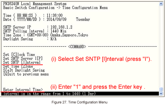 If you want to reflect the time immediately, select Set SNTP [I]nterval and enter 1 to Interval Time. (Refer to Figure 27)