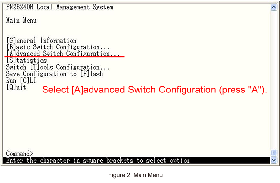 In Main Menu, select [A]dvanced Switch Configuration. (Refer to Figure 2)