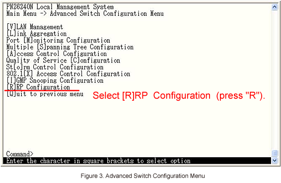 In Advanced Switch Configuration Menu, select [R]RP Configuration. (Refer to Figure 3)