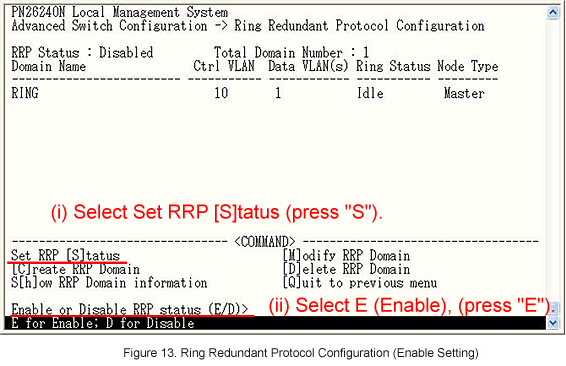 In Ring Redundant Protocol Configuration, select Set RRP [S]tatus to enable ring protocol. (Refer to Figure 13)