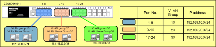 Create 3 VLAN groups in ZEQUO 6400 and set the IP address for each group.