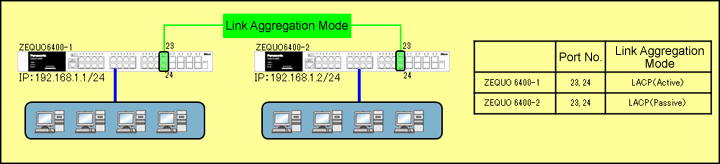 Set the link aggregation to ZEQUO 6400-1 Port23 and 24 and ZEQUO 6400-2 Port23 and 24, and extend the communication bandwidth (up to 2 Gbps in this setting).
