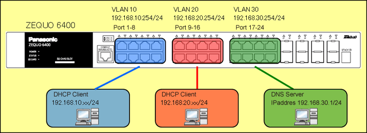 Referring to the configuration diagram, connect ZEQUO 6400 and the terminal. Confirm that the VLAN10 and VLAN20 terminals can acquire the IP address from ZEQUO 6400.