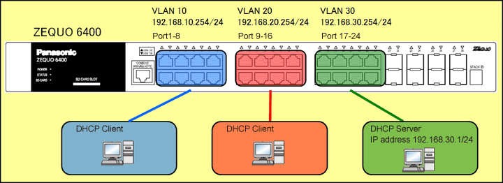 Referring to the configuration diagram, connect ZEQUO 6400 and the terminals. Confirm that the VLAN10 and VLAN20 terminals can acquire the IP address from the DHCP server.