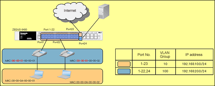 Set ZEQUO 6400 to process data for IP phone as voice VLAN when it receives at Port1-22.