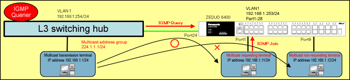 Confirm that the connection port to the L3 Ethernet Switch (the port receiving the IGMP Query) is studied on the router port, and that the connection port of the multicast requesting terminal is studied on the IGMP Snooping group table.