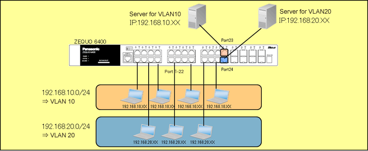 Referring the configuration drawing, connect servers to ZEQUO 6400, terminals with the IP address of 192.168.10.1/24 and 192.168.20.1/24 to the relevant ports of ZEQUO 6400 to confirm that the terminals can access to the servers of VLAN10 and VLAN20, respectively.