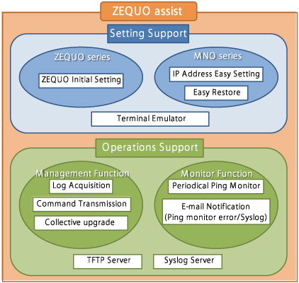 ZEQUO assist Plus is a Windows application which combines operations and settings of our Ethernet switch with various functions such as monitoring active devices. For details of each function, refer to Chapter 4 and later descriptions in this document.