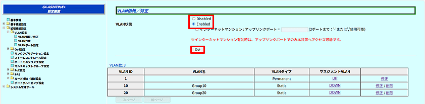 GA-AS24TPoE+②にVLANの設定を行います。(手順3-5と同様)
