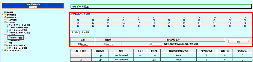 [拡張機能設定] > [PoE設定] > [PoEポート設定] と遷移し、ポートの給電機能をOFF/ONにします。