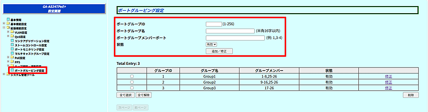 ③ グループID:3、グループ名:Group3 > ポート17-26