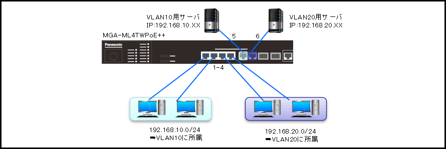 VLANの設定を行います。(VLAN10:ポート1-5、VLAN20:ポート1-4, 6)