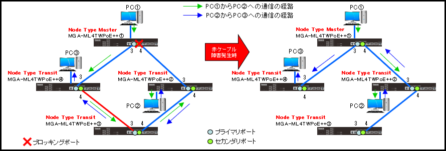 - 正常時はマスターのセカンダリポートがブロッキング状態になり、リング上で障害が発生するとブロッキングが開放されることで通信が継続されます。