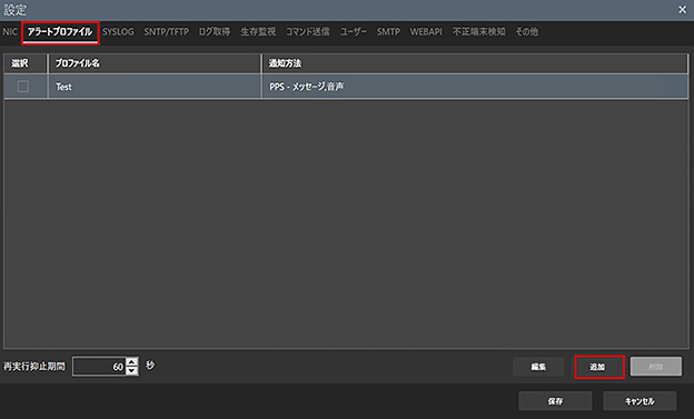 2) 「アラートプロファイル」を選択し、「追加」をクリックします。