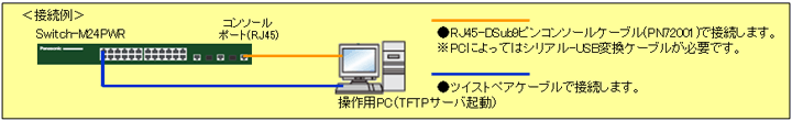 PCとMNO Seriesスイッチをツイストペアケーブルとコンソールケーブルで接続し、ハイパーターミナルにて設定画面を表示します。