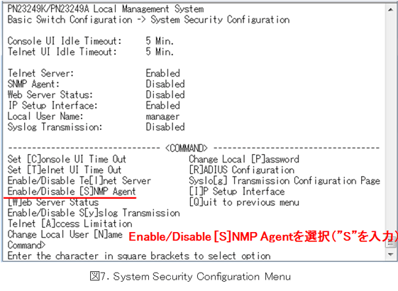 System Security Configurationにて、Enable/Disable [S]NMP Agentを選択し、SNMPを有効にします。(図7参照)