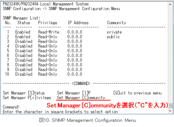 SNMP Management Configuration Menuにて、Set Manager [C]ommunityを選択し、3番にコミュニティ名(panasonic)を登録します。(図10参照)