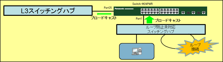 MNOシリーズスイッチにてストームコントロールを設定し、ブロードキャストやマルチキャストのストームで発生したフレームを抑制し、上位L3スイッチングハブへ転送されるフレーム数を制限する。