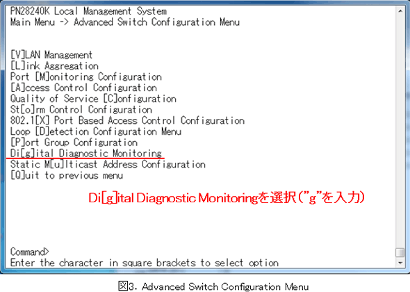 Advanced Switch Configuration Menuにて、Di[g]ital Diagnostic Monitoringを選択し、SFPモジュール状態確認画面に移行します。(図3参照)